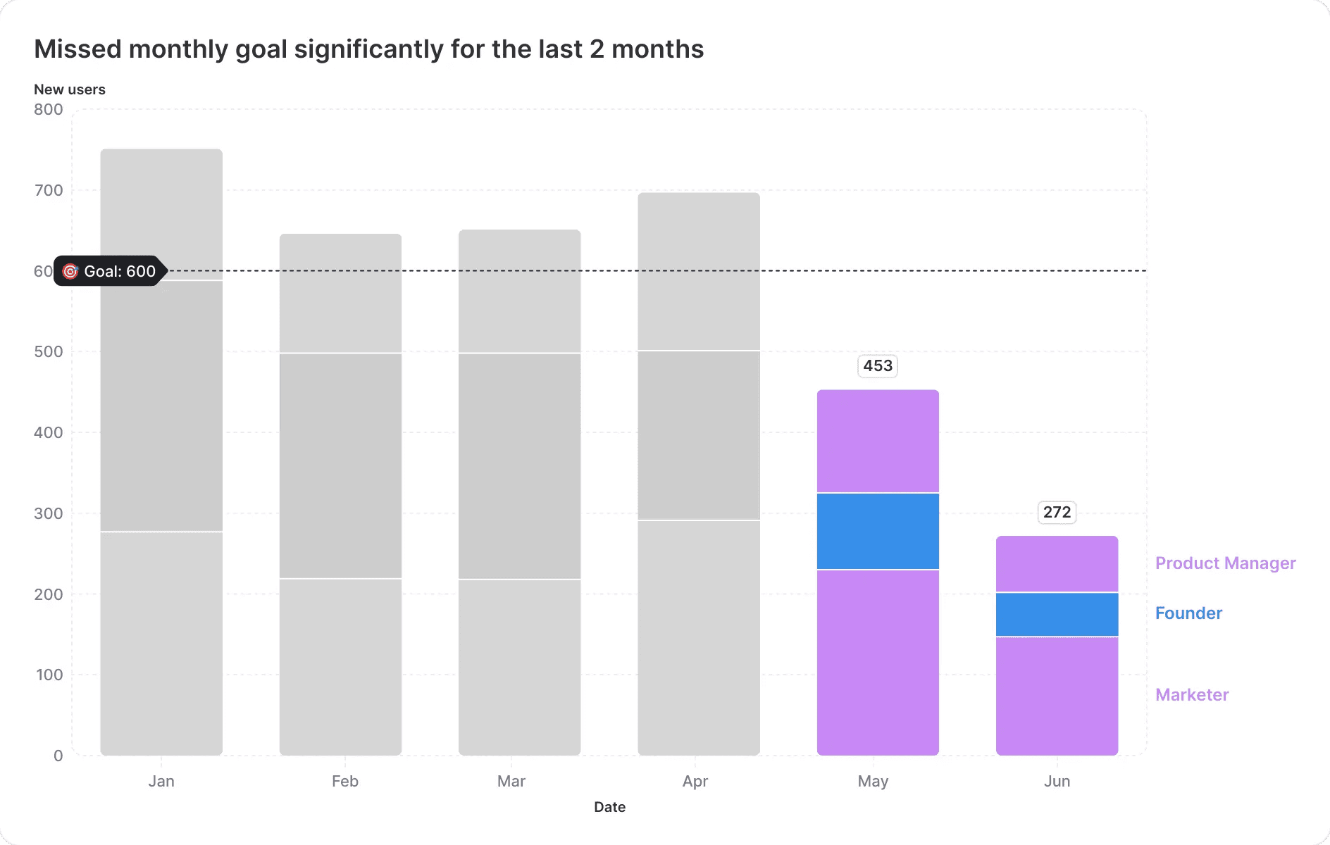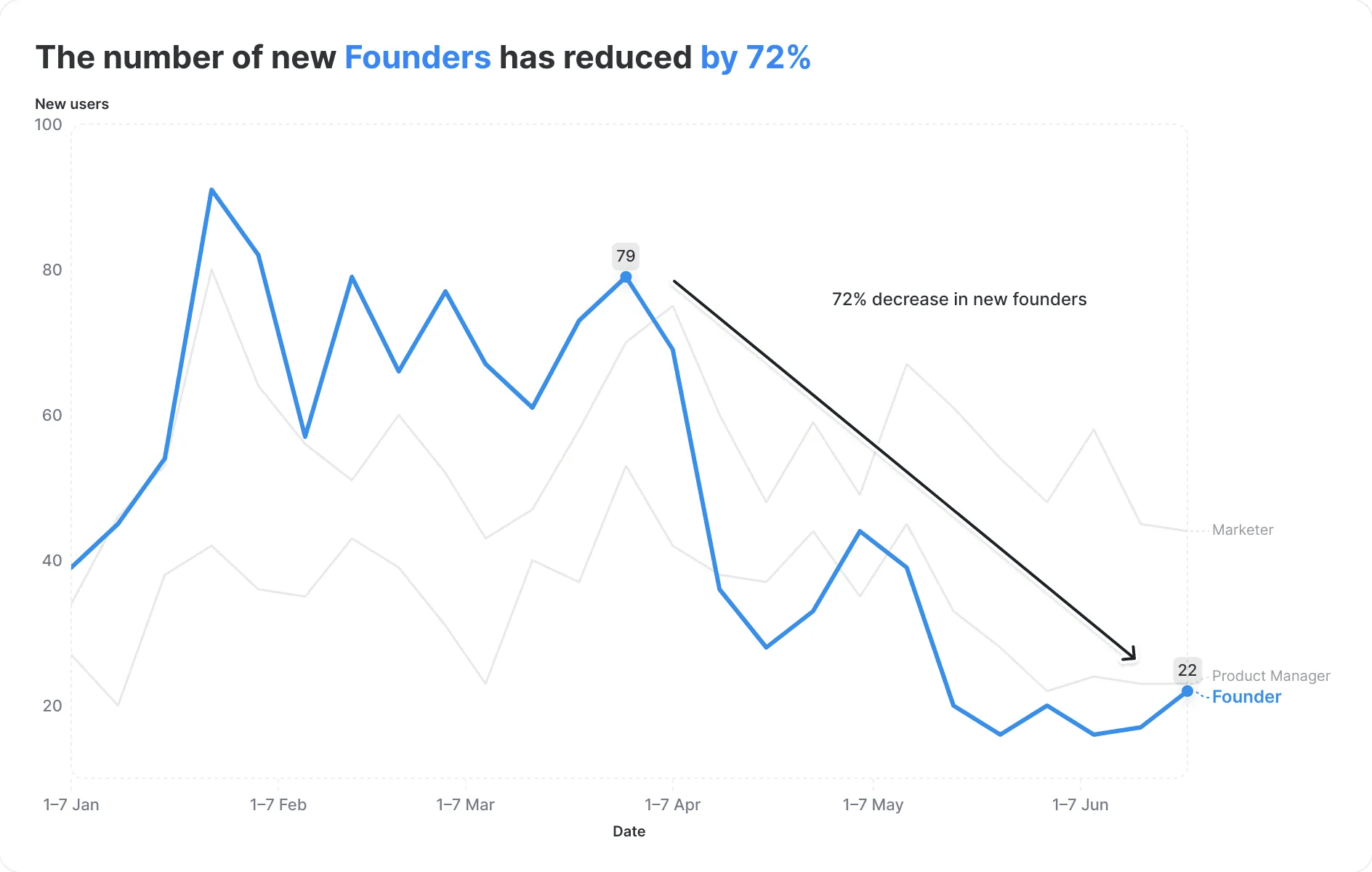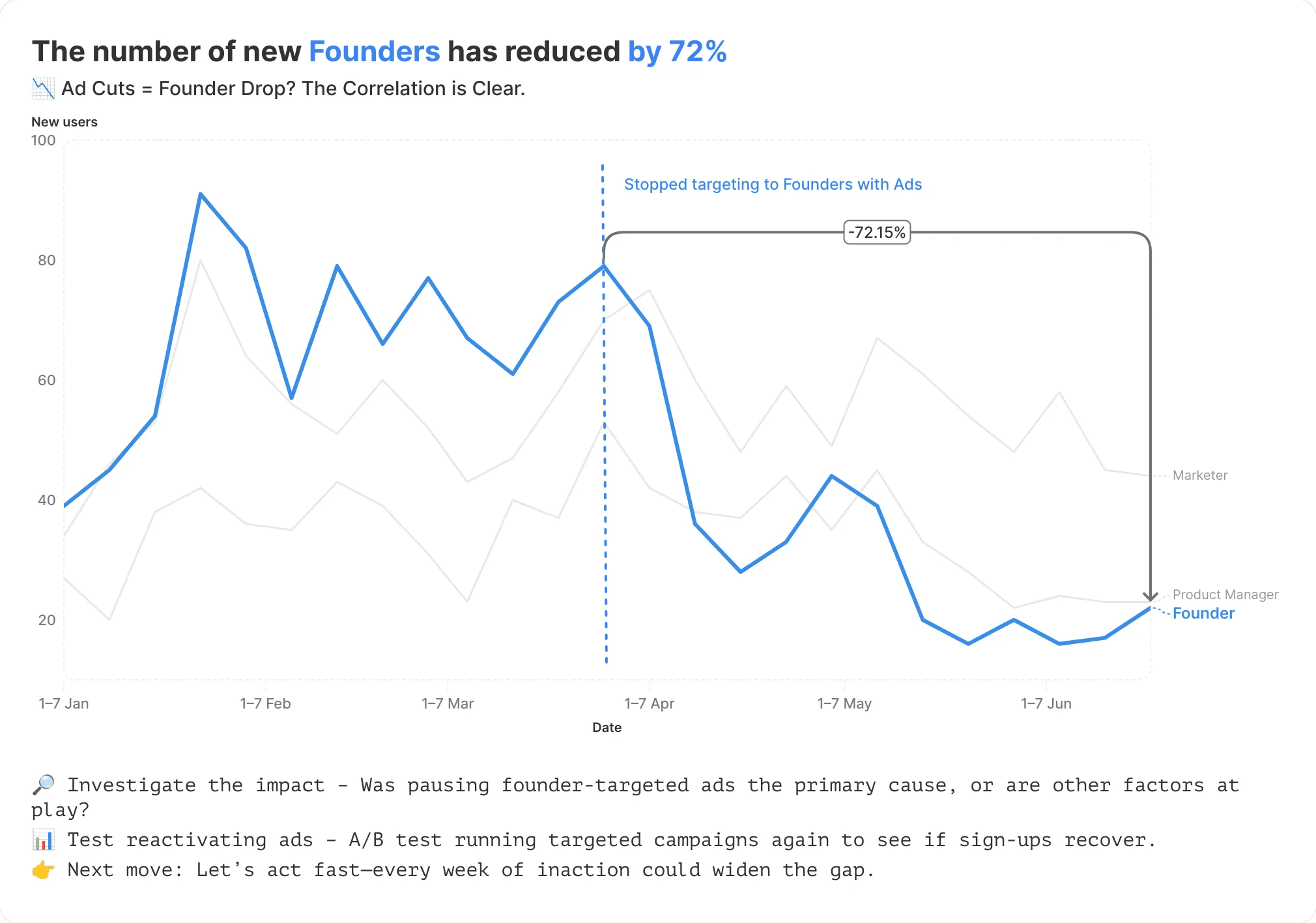 In our case: Why are founder signups dropping? Is it a market shift, an acquisition issue, or something else? Finding the right insight will help us take action.