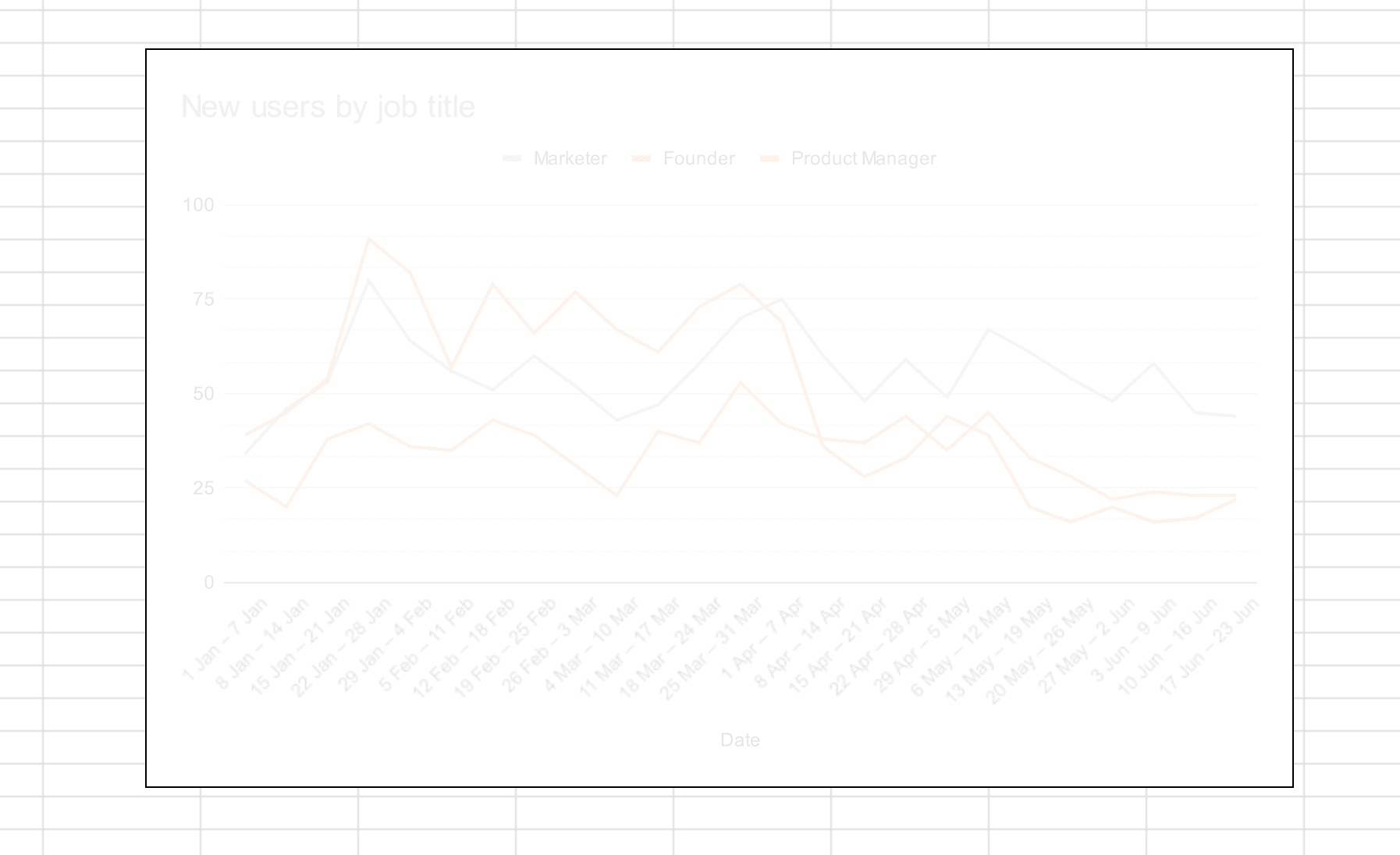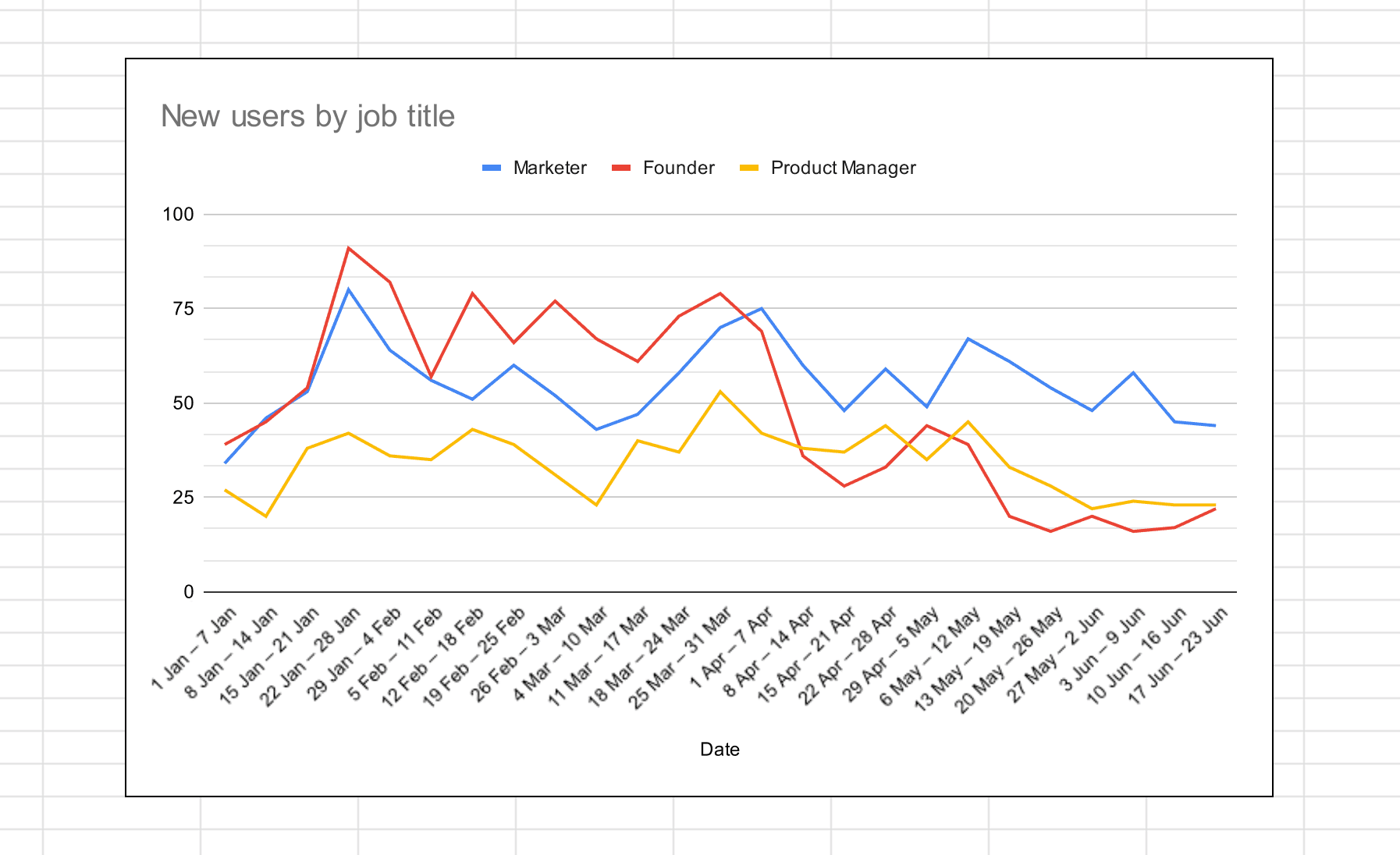 Using Google Sheets, we generate a default chart, in this example weโll only focus on 3 Job Titles from the spreadsheet.