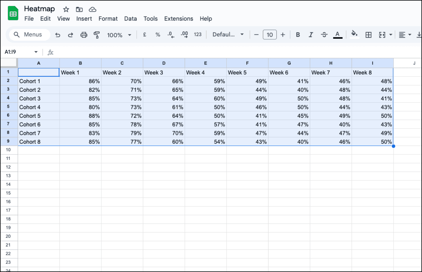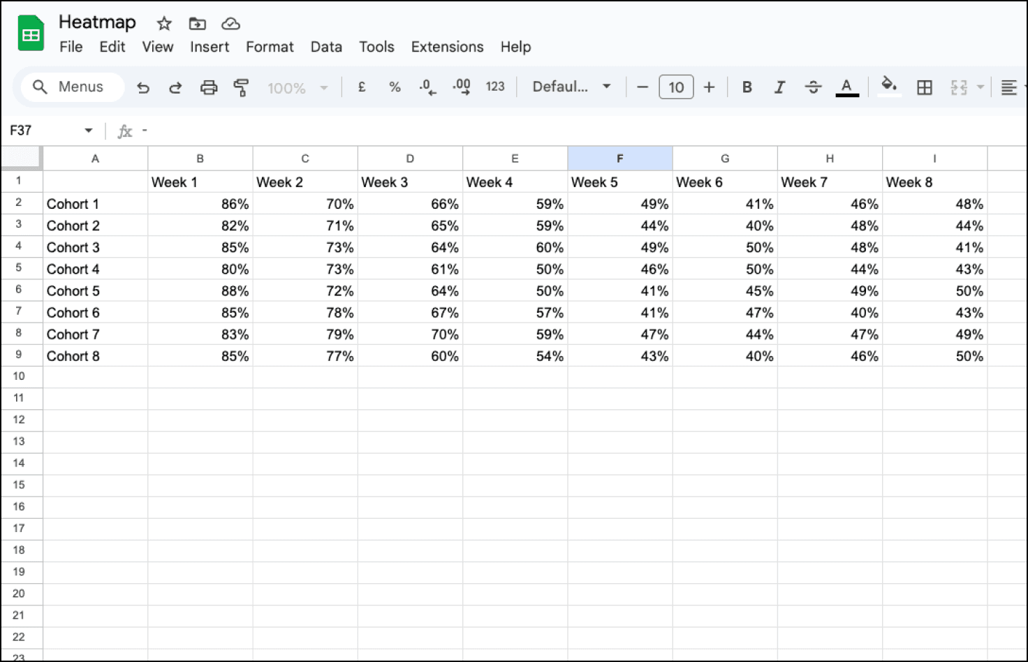 Instead of wrestling with conditional formatting, you simply upload or connect your data in Graphy. The platform automatically generates a heatmap layout with sensible defaults.